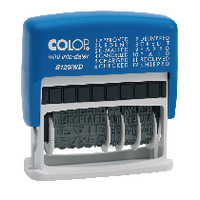 Colop S120/WD dial a phrase self inking text and date stamp. Prints 3.8mm letters in blue and red. Words include: Approved, Urgent, E-mailed, Cancelled, Charged, Checked, Delivered, Credit, Faxed, Paid, Received, Shipped.